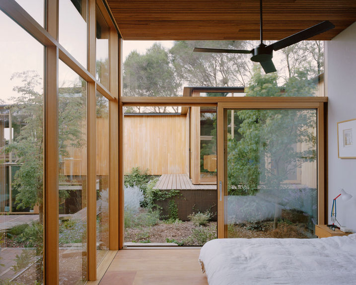 Corner House is an exploration of intersections, the project signified a profound moment of change in their lives, marking their retirement from respective architectural careers and a relocation from Melbourne to the Mornington Peninsula. They wanted a home that would facilitate a new chapter that prioritised both their connection and independence. Practically speaking, they wanted two bedrooms and two bathrooms, the capacity to work from home, ample shelving for their extensive design library and beautiful spaces to showcase their art collection. With one of the clients being a UK expat, prior to COVID, they expected family and friends to regularly visit, so it was important to include an area that would provide guests with a sense of their own space where they could comfortably stay for an extended period of time.
