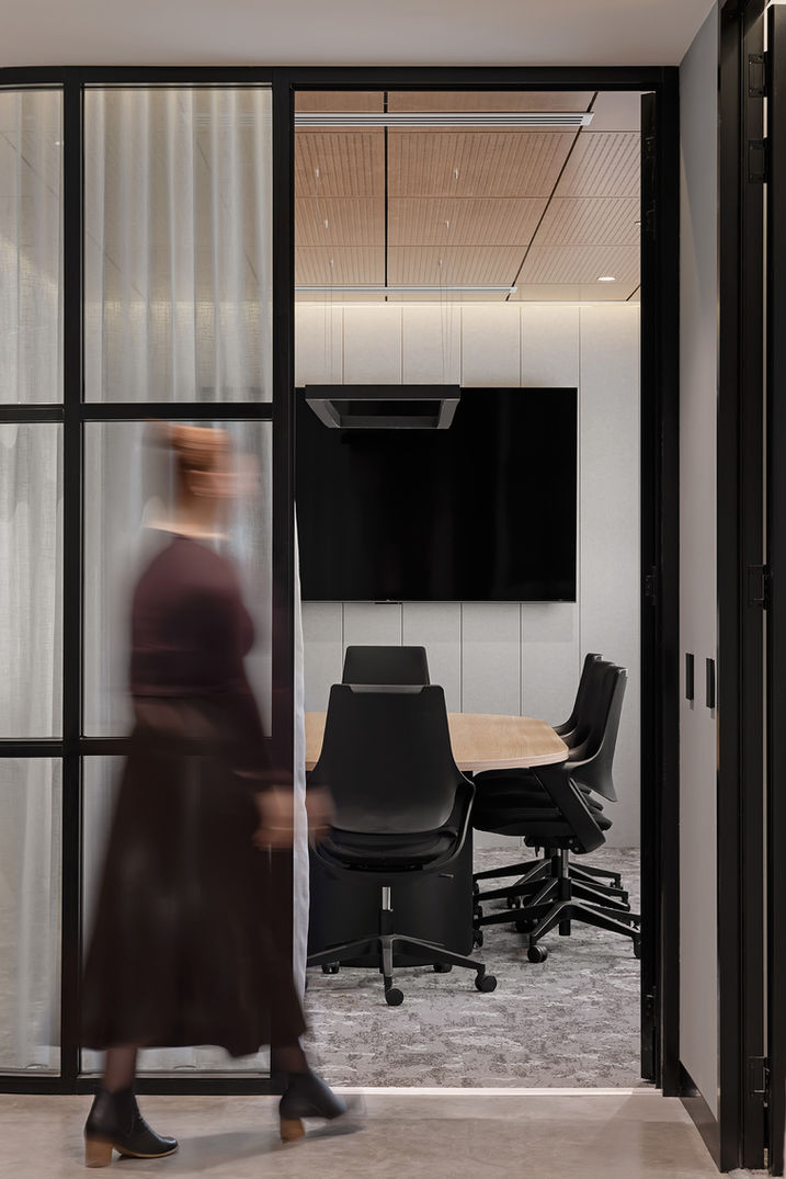 The entryway's deep rectangular space is compositionally layered to achieve depth and spaciousness. Between the undulating timber ceiling and polished concrete floor, the open greeting area not only serves as a versatile event and auction space, but effectively frames the reception area beyond. At the rear, the sleek industrial-style glass and metal partition of the meeting room offers a transparent separation without compromising openness.