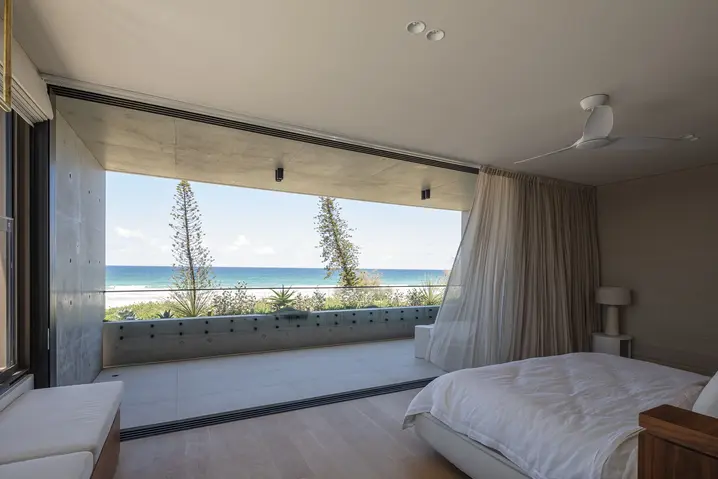 The first-floor living spaces are oriented to maximise ocean views while remaining strongly connected to the outdoors. This connection is reinforced through the integration of internal planters, a central fire pit, and expansive stacking glass doors that open directly to a suspended external pool. Acting as the heart of the home, the fire pit is positioned within a dramatic double-height volume, framed by the bedrooms above and crowned by an oculus that draws natural light deep into the centre of the house.